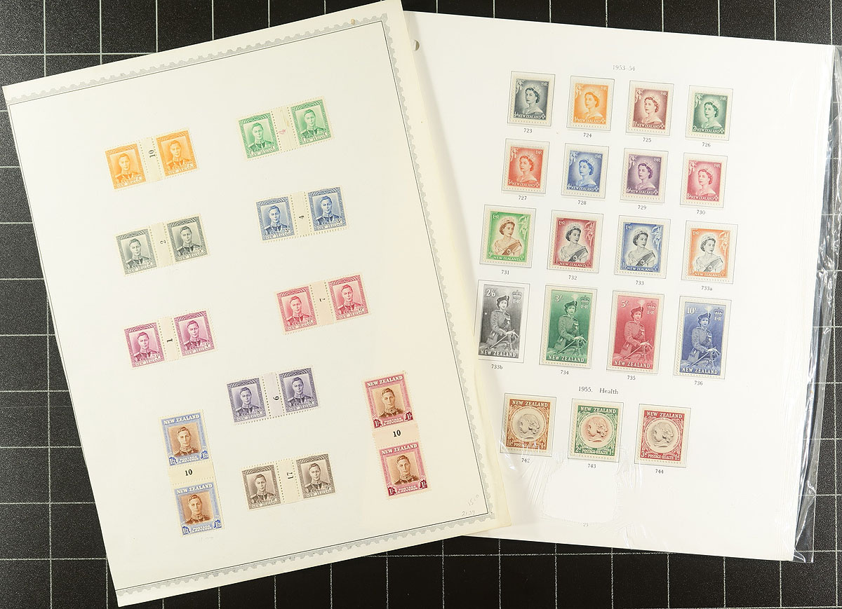 Stanley Gibbons padded red binder with pages up to 1983 with a good, mostly used, collection, including some health souvenir sheets (some mint, a couple used). This lot comes with bonus material in the form of three mounted collections, also a mix of mint and used. Some on Gibbons pages, others on homemade pages, the best being 10 mint "coil counter" pairs of the King George VI definitives (mint CP catalogue value NZ$170.00), with some Tokelau, even a couple of covers. If that isn’t enough, there is two bundles of old dealer "102" cards with a couple of hundred dollars of catalogue value throughout the 20th century. Happy hunting. Estimate =