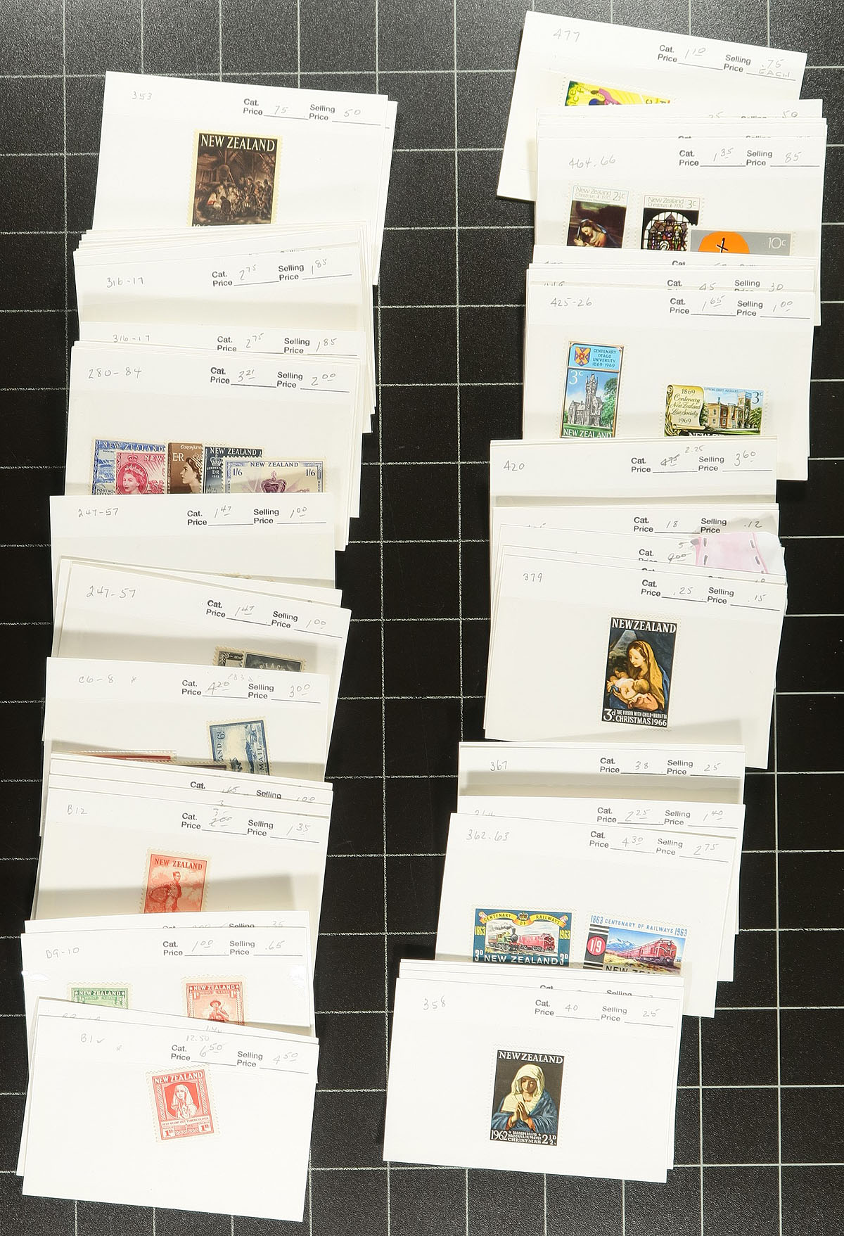 Stanley Gibbons padded red binder with pages up to 1983 with a good, mostly used, collection, including some health souvenir sheets (some mint, a couple used). This lot comes with bonus material in the form of three mounted collections, also a mix of mint and used. Some on Gibbons pages, others on homemade pages, the best being 10 mint "coil counter" pairs of the King George VI definitives (mint CP catalogue value NZ$170.00), with some Tokelau, even a couple of covers. If that isn’t enough, there is two bundles of old dealer "102" cards with a couple of hundred dollars of catalogue value throughout the 20th century. Happy hunting. Estimate =