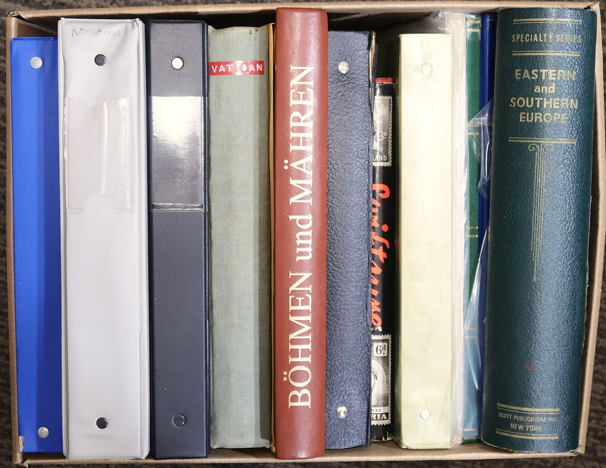 Europe-strong estate balance filling a bankers box. About half of the box is albums, stockbooks and binders with a range of multi-country offerings. The other half has one-country offerings (including a couple of nice albums), with Bulgaria, Romania, Vatican, Bohemia and Moravia. Many of these volumes were once individual bidboard lots, with catalogue values ranging from $150-$400 each, generally 15-20 years. Thousands of stamps here plus some good value amongst the albums. Offered as received. Estimate =