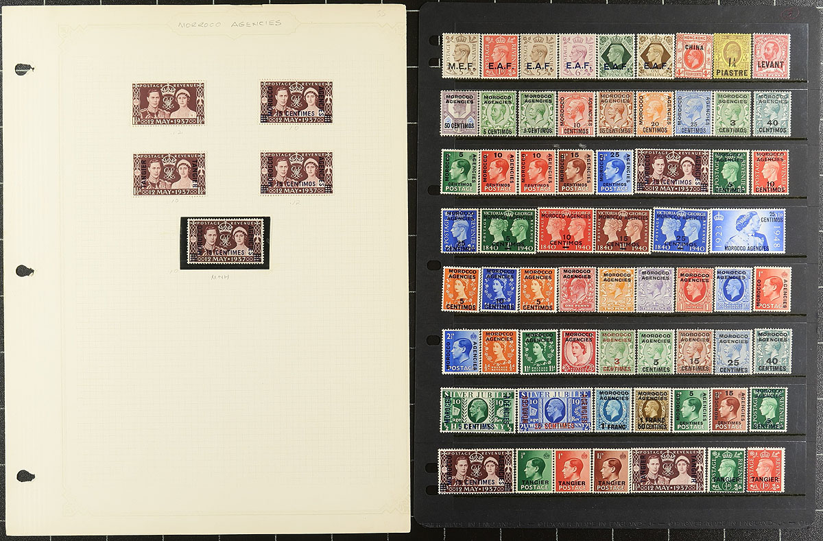 A series of "samplers" either on album pages or stockpages from this very popular collecting area. There are a few hundred mint (with some used) issues overprinted for use in British colonies in Africa, and the Levant. Strongest are the MEF, Eritrea, Somalia, Tripolitania, Morocco Agencies, Tangier, and Turkish offices. Expect the overall condition to be quite good, with the mint being hinged. As these pages are from different sources, some duplication is to be expected. Owner’s estimated (and conservative) 2024 Scott US$650.00 =