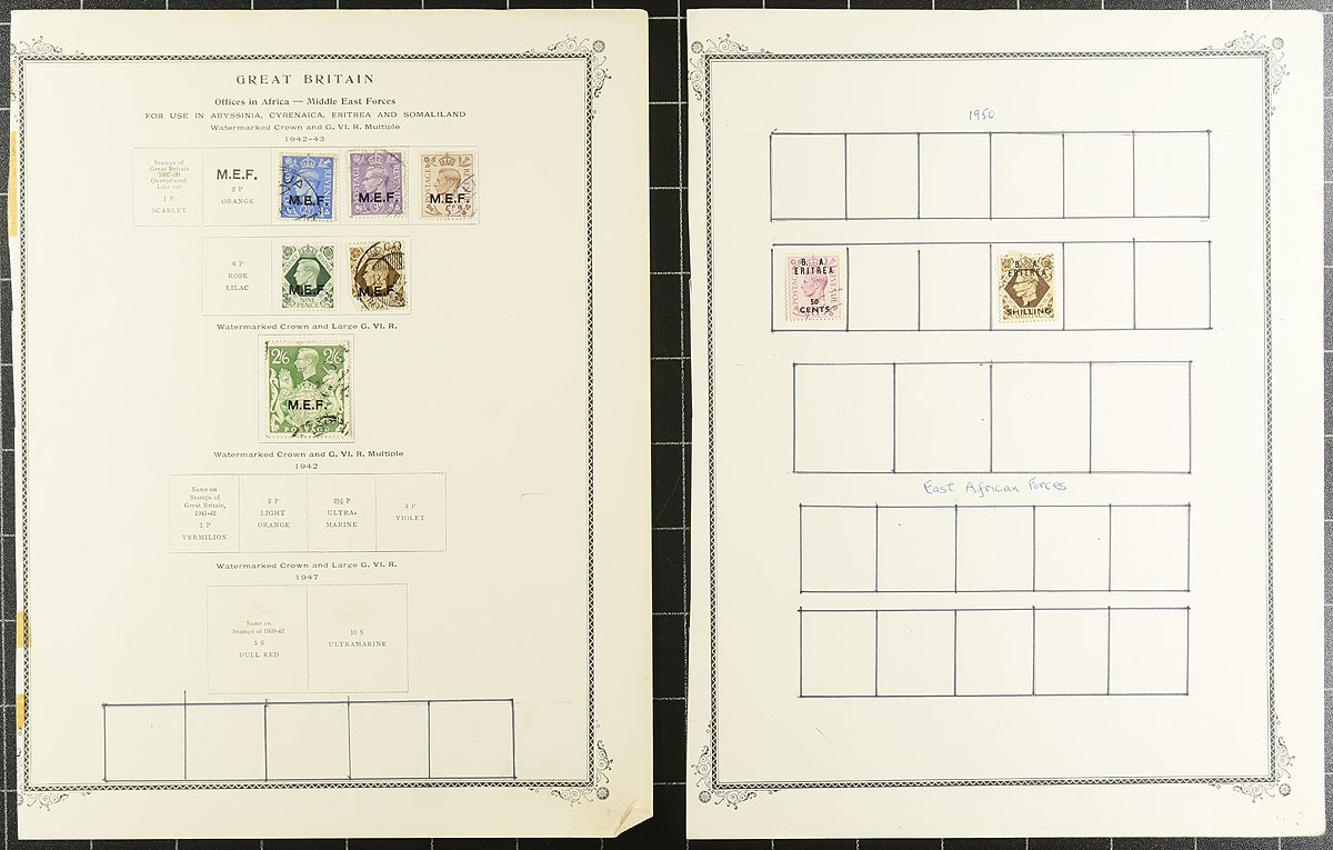 A series of "samplers" either on album pages or stockpages from this very popular collecting area. There are a few hundred mint (with some used) issues overprinted for use in British colonies in Africa, and the Levant. Strongest are the MEF, Eritrea, Somalia, Tripolitania, Morocco Agencies, Tangier, and Turkish offices. Expect the overall condition to be quite good, with the mint being hinged. As these pages are from different sources, some duplication is to be expected. Owner’s estimated (and conservative) 2024 Scott US$650.00 =