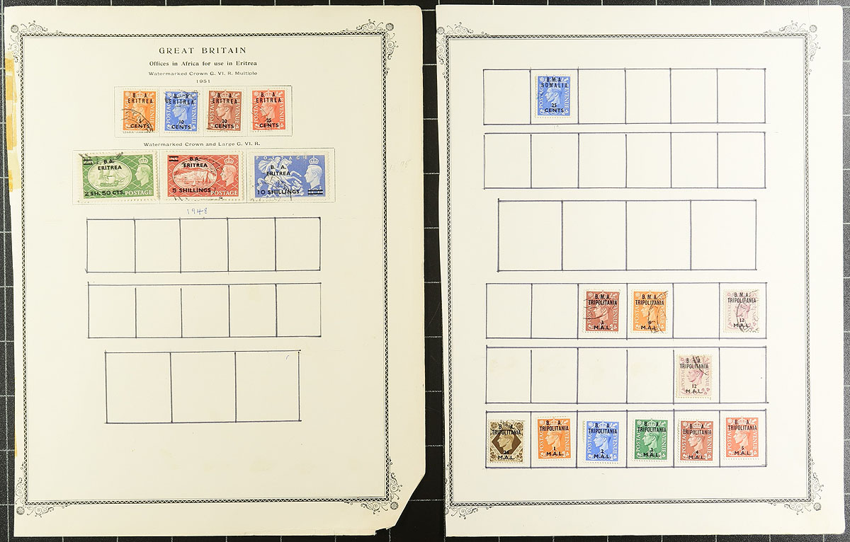 A series of "samplers" either on album pages or stockpages from this very popular collecting area. There are a few hundred mint (with some used) issues overprinted for use in British colonies in Africa, and the Levant. Strongest are the MEF, Eritrea, Somalia, Tripolitania, Morocco Agencies, Tangier, and Turkish offices. Expect the overall condition to be quite good, with the mint being hinged. As these pages are from different sources, some duplication is to be expected. Owner’s estimated (and conservative) 2024 Scott US$650.00 =