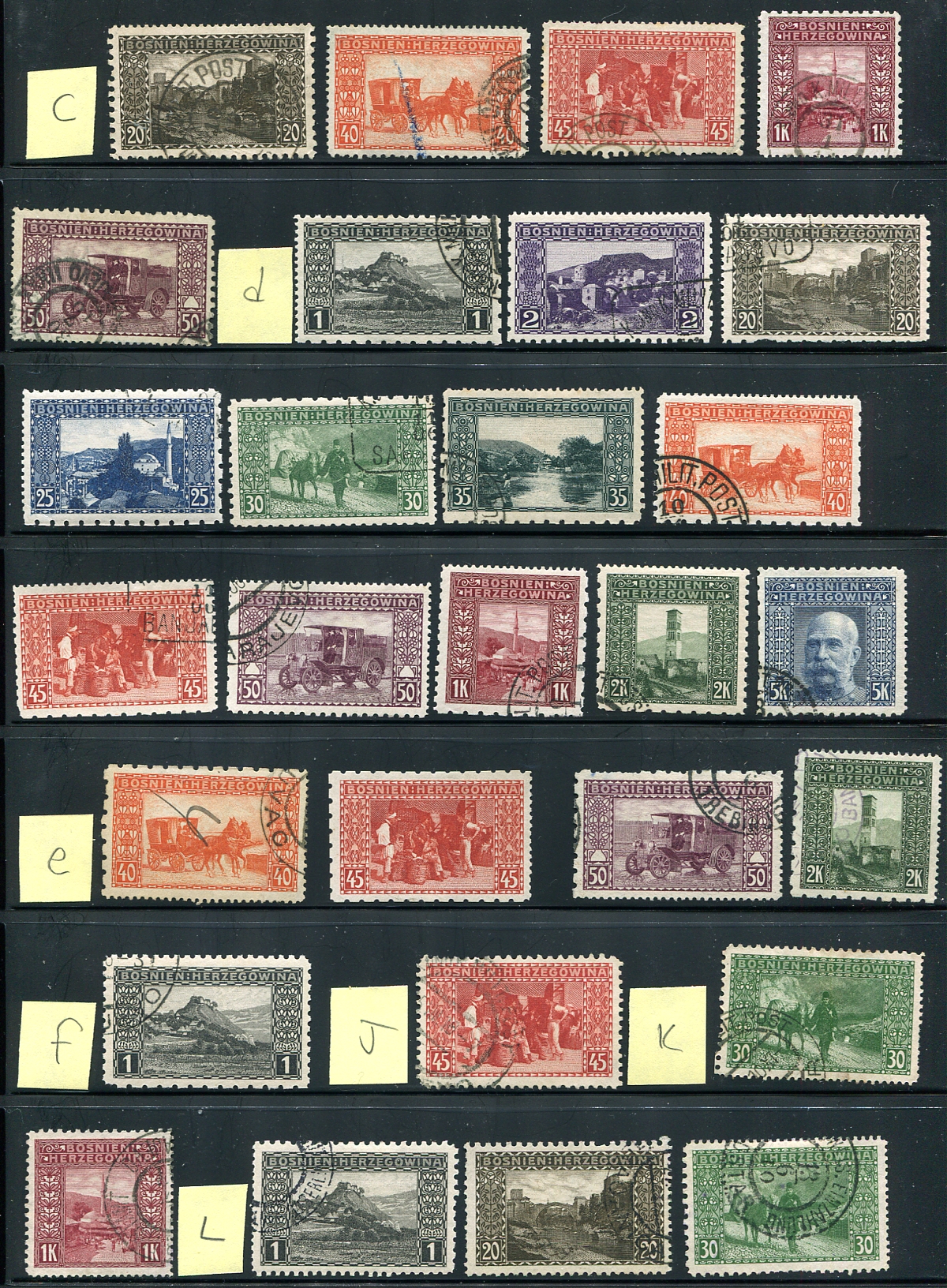 A selection of 33 different used "compound perforation" issues from the 1906 "Pictorial" issue caused by individual sheets being line perforated with very different perforation gauges between various rows, causing single stamps to have 2 or 3 different perforated sides. This is a fresh-looking group, with values up to the 5kr Franz Josef. Owner’s 2021 Scott Specialized US$1496.00 =
