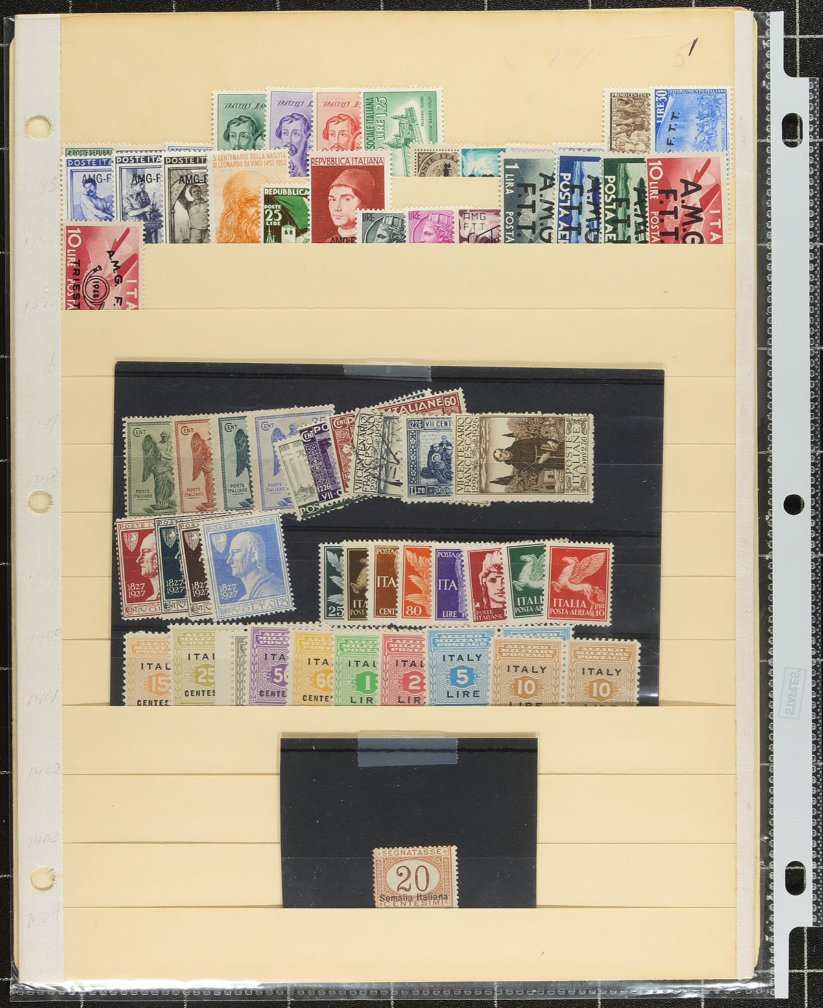 Estate holding #1: The mint portion (although a few used stamps have snuck in), with good distribution of stamps throughout the 20th century, including back of the book, such as AMG Trieste overprints, a nice Italian Somaliland postage due #J14a (overprint at the bottom - cat $170.00). A couple of bonus items are a page of colourful Roman reprint/forgeries and an interesting greeting card wishing Victory in 1945 using Italian & colonial stamps. There could be a few faults and a touch of duplication, but this is a great way to build a collection. Estimate =