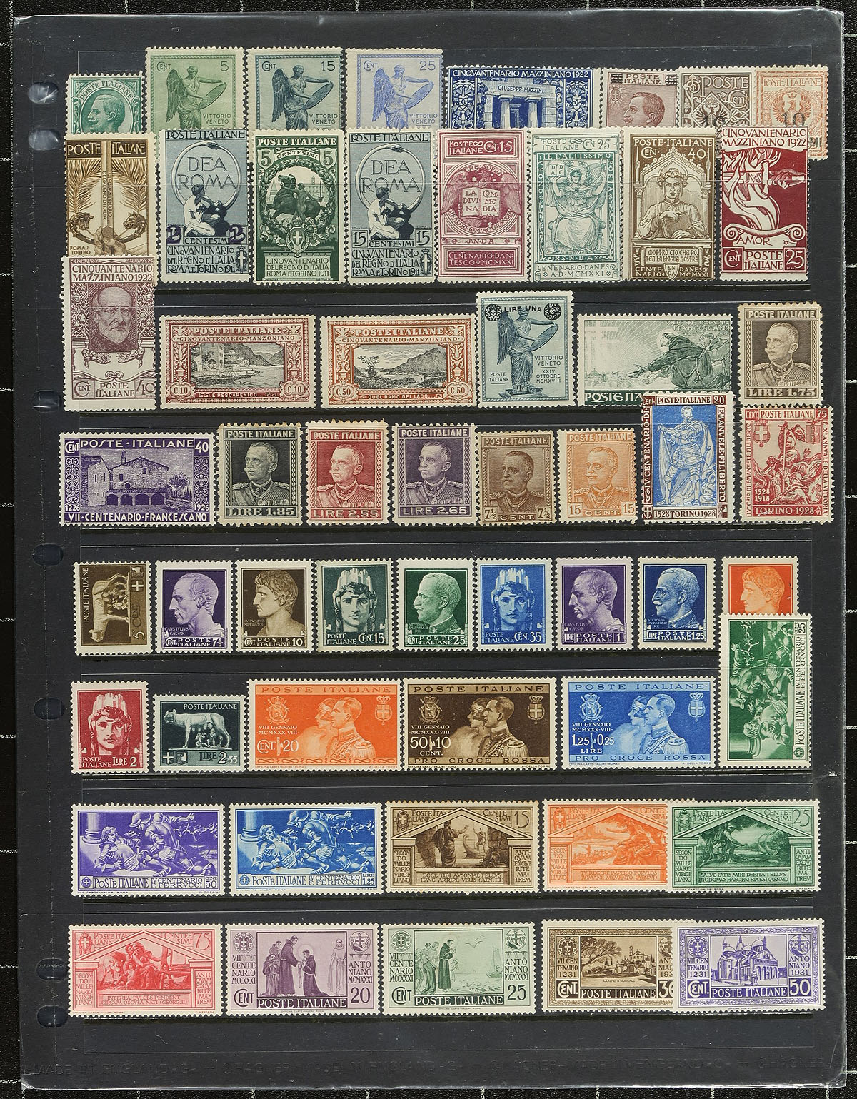 Estate holding #1: The mint portion (although a few used stamps have snuck in), with good distribution of stamps throughout the 20th century, including back of the book, such as AMG Trieste overprints, a nice Italian Somaliland postage due #J14a (overprint at the bottom - cat $170.00). A couple of bonus items are a page of colourful Roman reprint/forgeries and an interesting greeting card wishing Victory in 1945 using Italian & colonial stamps. There could be a few faults and a touch of duplication, but this is a great way to build a collection. Estimate =