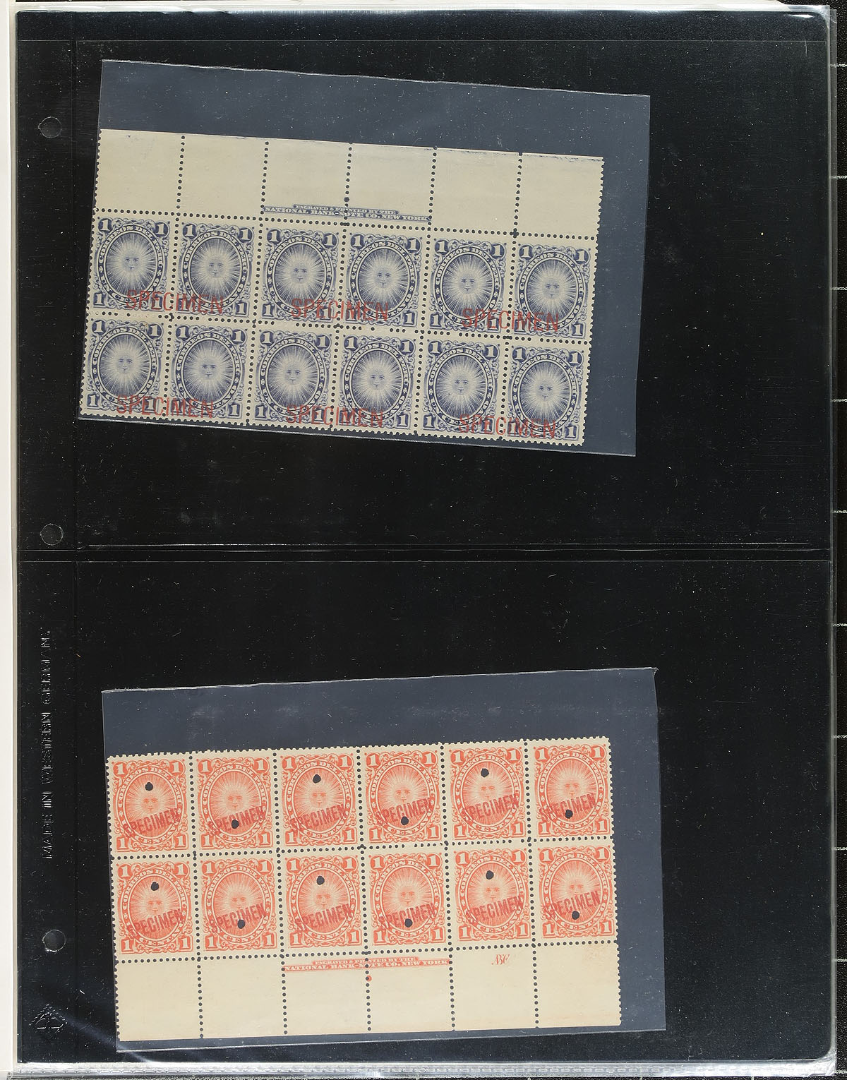 Mint blocks ranging from 4-12 stamps from 1886-1905 issues, all overprinted "SPECIMEN" most with security punch holes. Four of the larger blocks have nice imprints. The 20c orange issue has an administrative rubber stamp. A total of 106 stamps. An easy way to add some showpieces to your collection. Estimate =