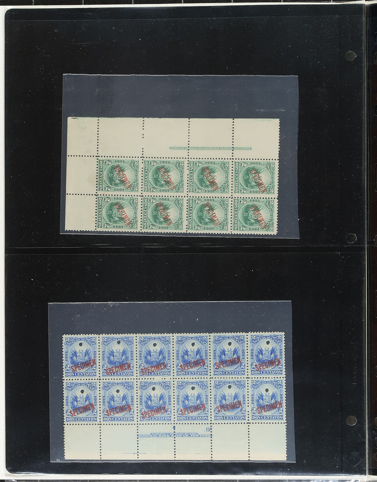 Mint blocks ranging from 4-12 stamps from 1886-1905 issues, all overprinted "SPECIMEN" most with security punch holes. Four of the larger blocks have nice imprints. The 20c orange issue has an administrative rubber stamp. A total of 106 stamps. An easy way to add some showpieces to your collection. Estimate =