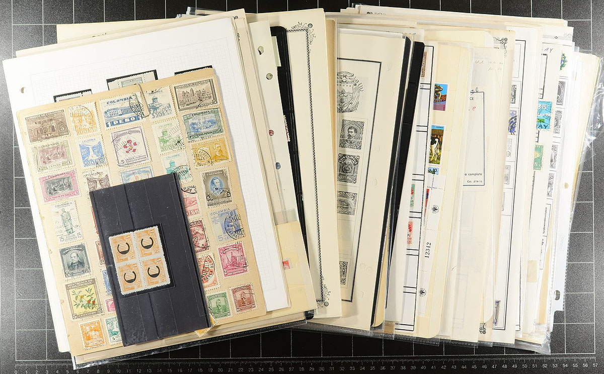 Latin America Bundle #1: From a local estate, where this collector bought everything that suited his fancy and then left them untouched. Bidboard lots, album pages, dealer cards, with a range of mint and used, with some back of the book and the occasional "weird" item. We note Venezuela (with a good batch of used air mails, a nice page of mint "earlies"), Uruguay (a duo with Bileski-promoted inverts, a 1956 FD folder, some revenues), Peru, Paraguay, Ecuador, Colombia (with a collection on Scott Specialty pages up to 1981). Some better material mixed in among the common. Fun and value here! Estimate =