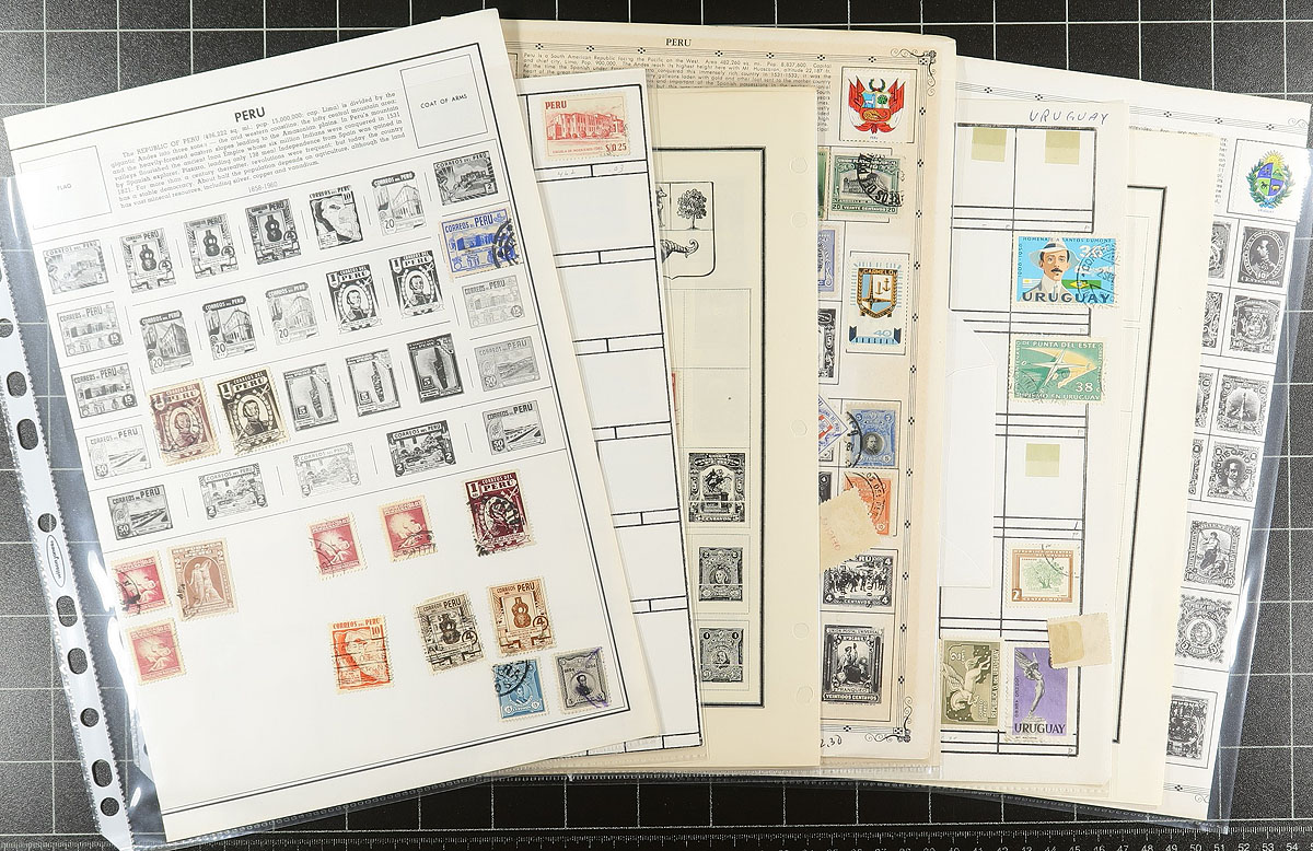 Latin America Bundle #1: From a local estate, where this collector bought everything that suited his fancy and then left them untouched. Bidboard lots, album pages, dealer cards, with a range of mint and used, with some back of the book and the occasional "weird" item. We note Venezuela (with a good batch of used air mails, a nice page of mint "earlies"), Uruguay (a duo with Bileski-promoted inverts, a 1956 FD folder, some revenues), Peru, Paraguay, Ecuador, Colombia (with a collection on Scott Specialty pages up to 1981). Some better material mixed in among the common. Fun and value here! Estimate =