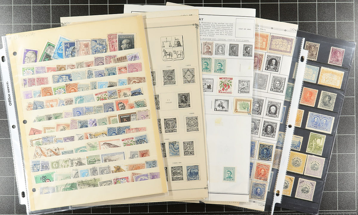 Latin America Bundle #1: From a local estate, where this collector bought everything that suited his fancy and then left them untouched. Bidboard lots, album pages, dealer cards, with a range of mint and used, with some back of the book and the occasional "weird" item. We note Venezuela (with a good batch of used air mails, a nice page of mint "earlies"), Uruguay (a duo with Bileski-promoted inverts, a 1956 FD folder, some revenues), Peru, Paraguay, Ecuador, Colombia (with a collection on Scott Specialty pages up to 1981). Some better material mixed in among the common. Fun and value here! Estimate =