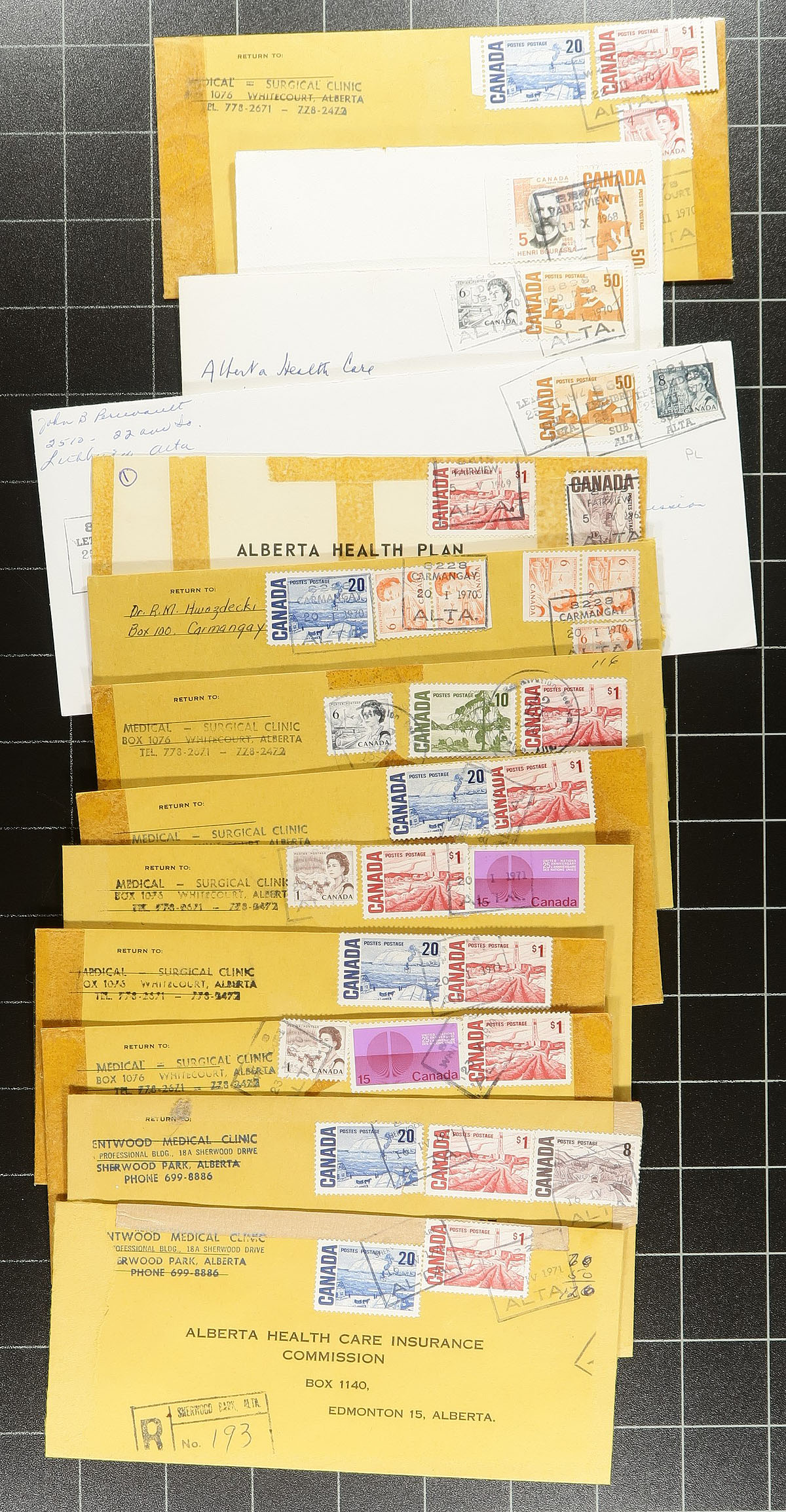 Alberta MOON cancel holding on covers or parcel labels. A total of 70 items, many are registered, most are early 1970's with lots of higher denomination Centennials, along with a number of difficult MOON cancels. Most are #8 sized, which is difficult to find small items with these big rates. There is some duplication, but this is not a lot to overlook. Estimate =