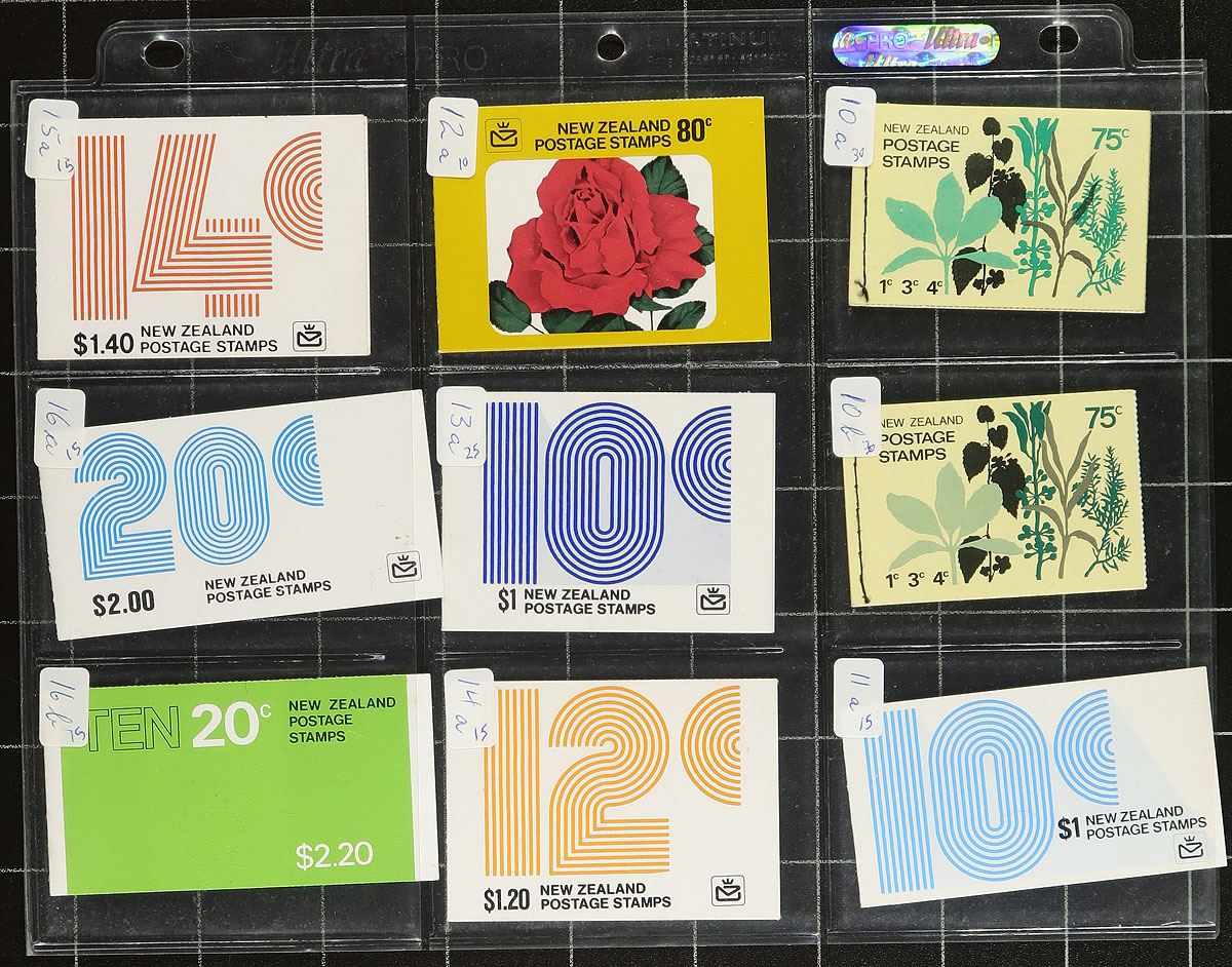Queen Elizabeth II, 20th century, complete booklets. About 80 lightly duplicated, many identified by Campbell Paterson (noted 3 copies of W7b, NZ$45.00 each), and W8b ($95.00), with the 1990's issues having a face value of over NZN$150.00. Great to build your collection. Estimate =