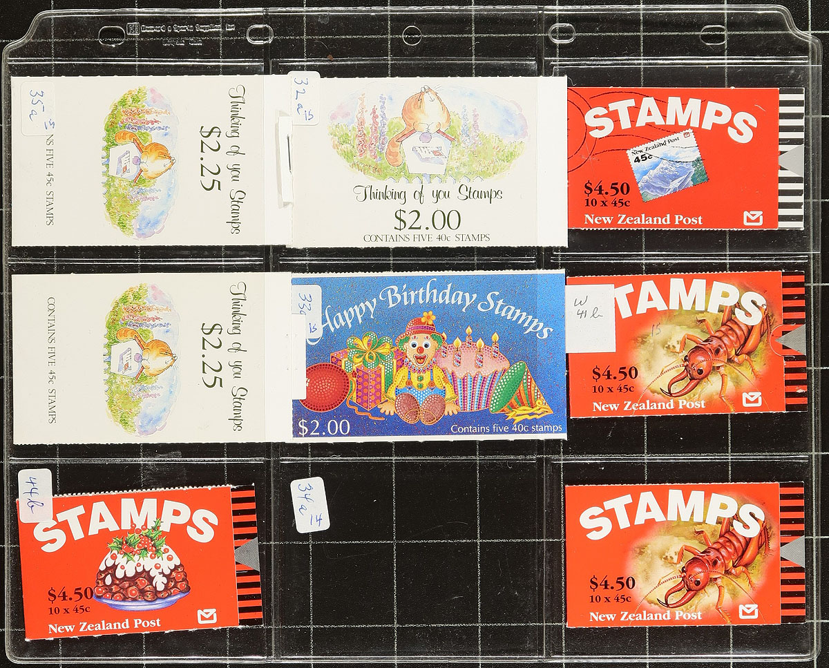 Queen Elizabeth II, 20th century, complete booklets. About 80 lightly duplicated, many identified by Campbell Paterson (noted 3 copies of W7b, NZ$45.00 each), and W8b ($95.00), with the 1990's issues having a face value of over NZN$150.00. Great to build your collection. Estimate =