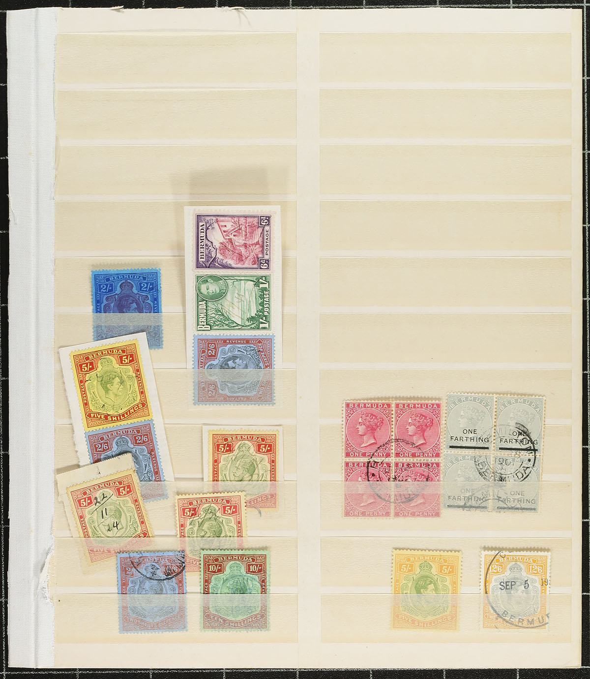 Envelope box with the balance of an extensive estate of Bermuda that we have been breaking up over the past year. There is a bit of mint and used Queen Victoria to King George V (the "Keyplates" are generally revenue cancelled), with some multiples, nice cancels and individual stamps. This collector bought new issues, while living in Hamilton, from the late KGVI period to about 1977, with singles, sets, some blocks of 4, and a few larger. Most of these are still in their original post office glassine envelopes and are in pristine condition. There is disorder here, and it is quite possible that there are better items hiding here or there. As received. Estimate =