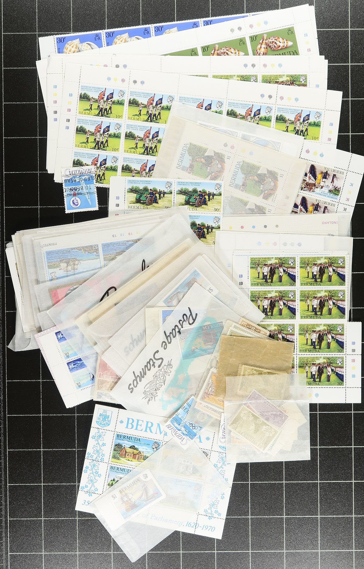 Envelope box with the balance of an extensive estate of Bermuda that we have been breaking up over the past year. There is a bit of mint and used Queen Victoria to King George V (the "Keyplates" are generally revenue cancelled), with some multiples, nice cancels and individual stamps. This collector bought new issues, while living in Hamilton, from the late KGVI period to about 1977, with singles, sets, some blocks of 4, and a few larger. Most of these are still in their original post office glassine envelopes and are in pristine condition. There is disorder here, and it is quite possible that there are better items hiding here or there. As received. Estimate =