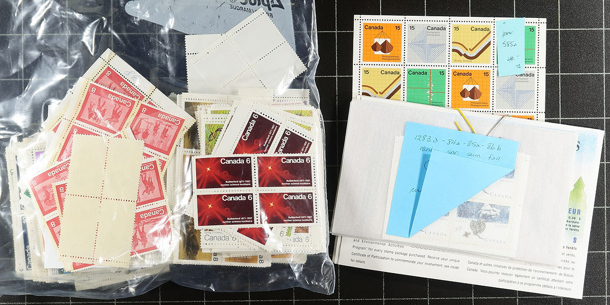 Mint "Postage PLUS" accumulation. There is lots of sorted and semi-sorted mint stamps in the 1c-30c range (mostly up to 8c values, but saw pockets of up to 50c), but it isn’t all your run of the mill material. There are souvenir sheets (including 4 of the 1972 GeoTechnical sheet of 16, 10 of Winnie the Pooh, a few complete booklets back to the Wilding issue. There is a batch that are described as having paper and tagging variants (we haven’t checked these). There are also potentially better singles such as faulty issues back to Queen Victoria and some slightly off-centred material from the 1930s (with huge catalogue value here). Fills a small shoebox. The basic face value is likely around $300.00. Estimate =