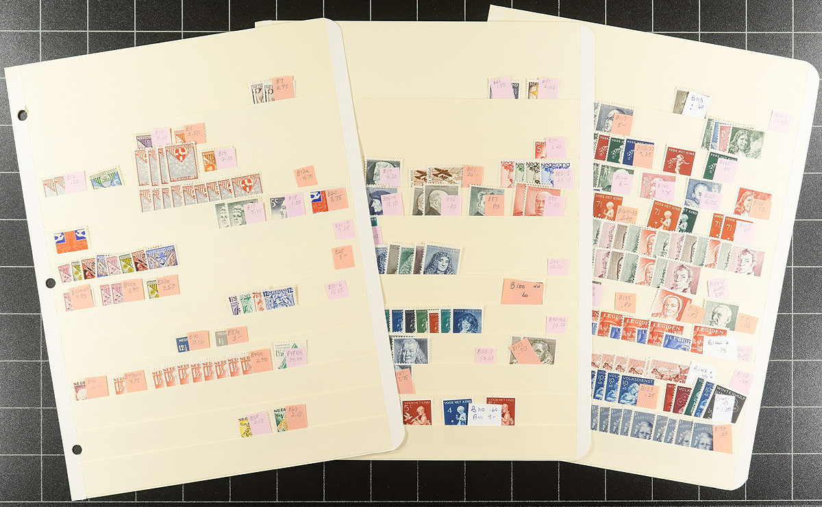 A "back of the book" mint accumulation on 27 manila stockpages with a wide range of issues, generally up to a dozen of a type all identified and catalogued by Scott. Some better includes #B276-280 and #B271-295 (6 sets of each), #J75, #J82, #J102, #O1-O7. Overall condition is quite good with few faults to be expected. Substantial value here. Estimate =