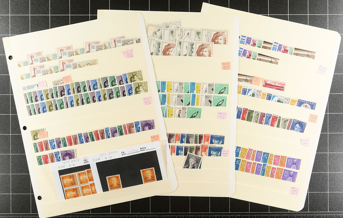 A "back of the book" mint accumulation on 27 manila stockpages with a wide range of issues, generally up to a dozen of a type all identified and catalogued by Scott. Some better includes #B276-280 and #B271-295 (6 sets of each), #J75, #J82, #J102, #O1-O7. Overall condition is quite good with few faults to be expected. Substantial value here. Estimate =