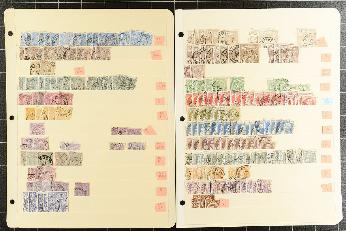 Neatly organized used wholesale accumulation of regular Belgian issues (there is a touch from the "back of the book") in quantities up to a dozen of each. There are better throughout, such as #16 (x9), #25b, #26b, #72 (x5), #91 (x11) and more. Plus there are lots of terrific cancels throughout. All with Scott numbers and 2023 catalogue prices on 17 manila stockpages. Great for building or upgrading collections or stocks. Estimate =