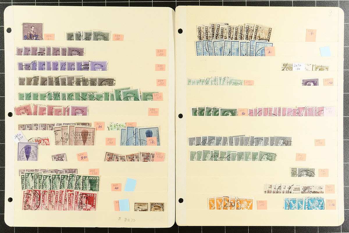 Neatly organized used wholesale accumulation of regular Belgian issues (there is a touch from the "back of the book") in quantities up to a dozen of each. There are better throughout, such as #16 (x9), #25b, #26b, #72 (x5), #91 (x11) and more. Plus there are lots of terrific cancels throughout. All with Scott numbers and 2023 catalogue prices on 17 manila stockpages. Great for building or upgrading collections or stocks. Estimate =