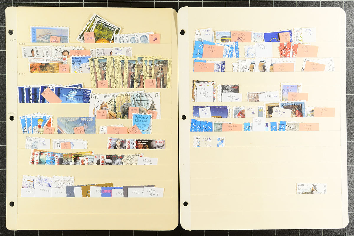 Neatly organized used wholesale accumulation of regular Belgian issues (there is a touch from the "back of the book") in quantities up to a dozen of each. There are better throughout, such as #16 (x9), #25b, #26b, #72 (x5), #91 (x11) and more. Plus there are lots of terrific cancels throughout. All with Scott numbers and 2023 catalogue prices on 17 manila stockpages. Great for building or upgrading collections or stocks. Estimate =