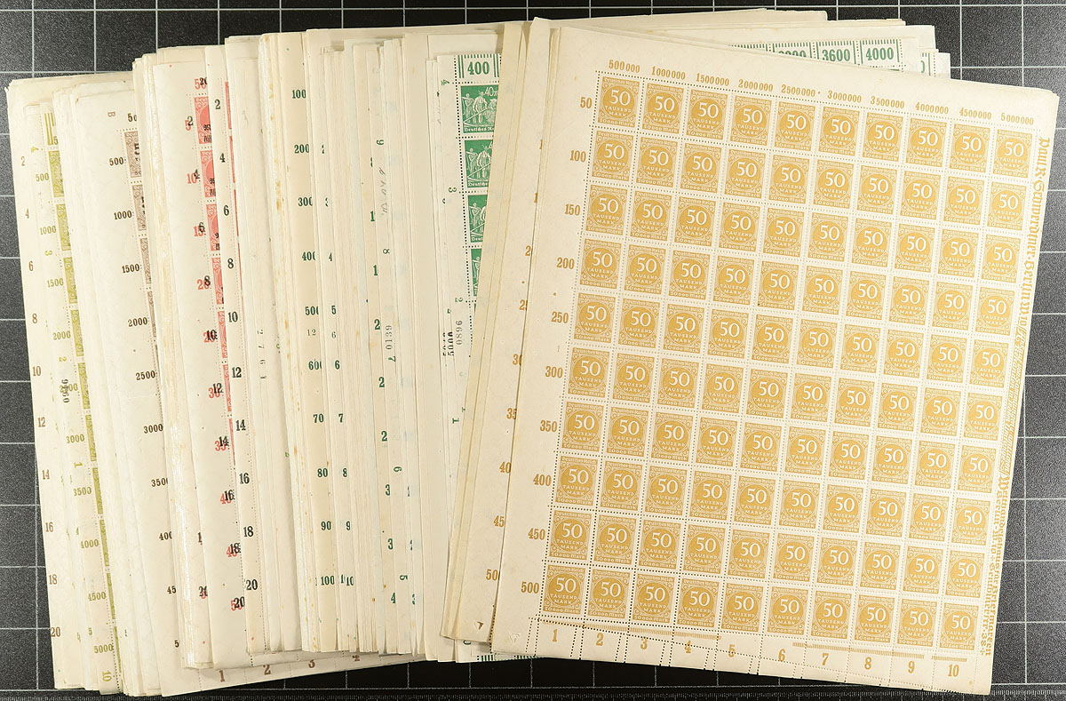 Bundle with a couple hundred mint complete sheets from the post-WWI hyper-inflation era. Has light to moderate duplication, most appear to be never hinged, and only a couple of gum faults are noted. While most of the stamps are common, these sheets are little works of art with interesting printing in the selvedge. A couple of the sheets were apparently caught in the perforator twice, as there are double perforations in the selvage. Estimate =