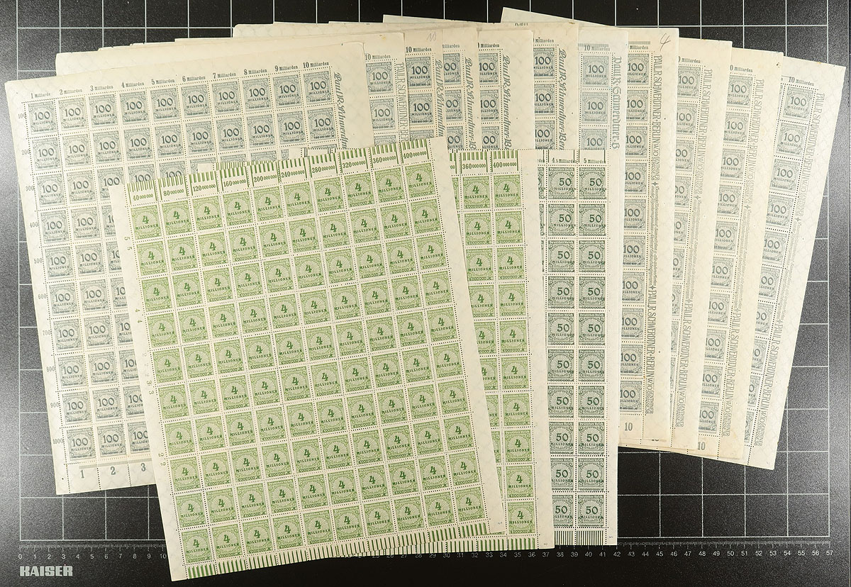 Bundle with a couple hundred mint complete sheets from the post-WWI hyper-inflation era. Has light to moderate duplication, most appear to be never hinged, and only a couple of gum faults are noted. While most of the stamps are common, these sheets are little works of art with interesting printing in the selvedge. A couple of the sheets were apparently caught in the perforator twice, as there are double perforations in the selvage. Estimate =