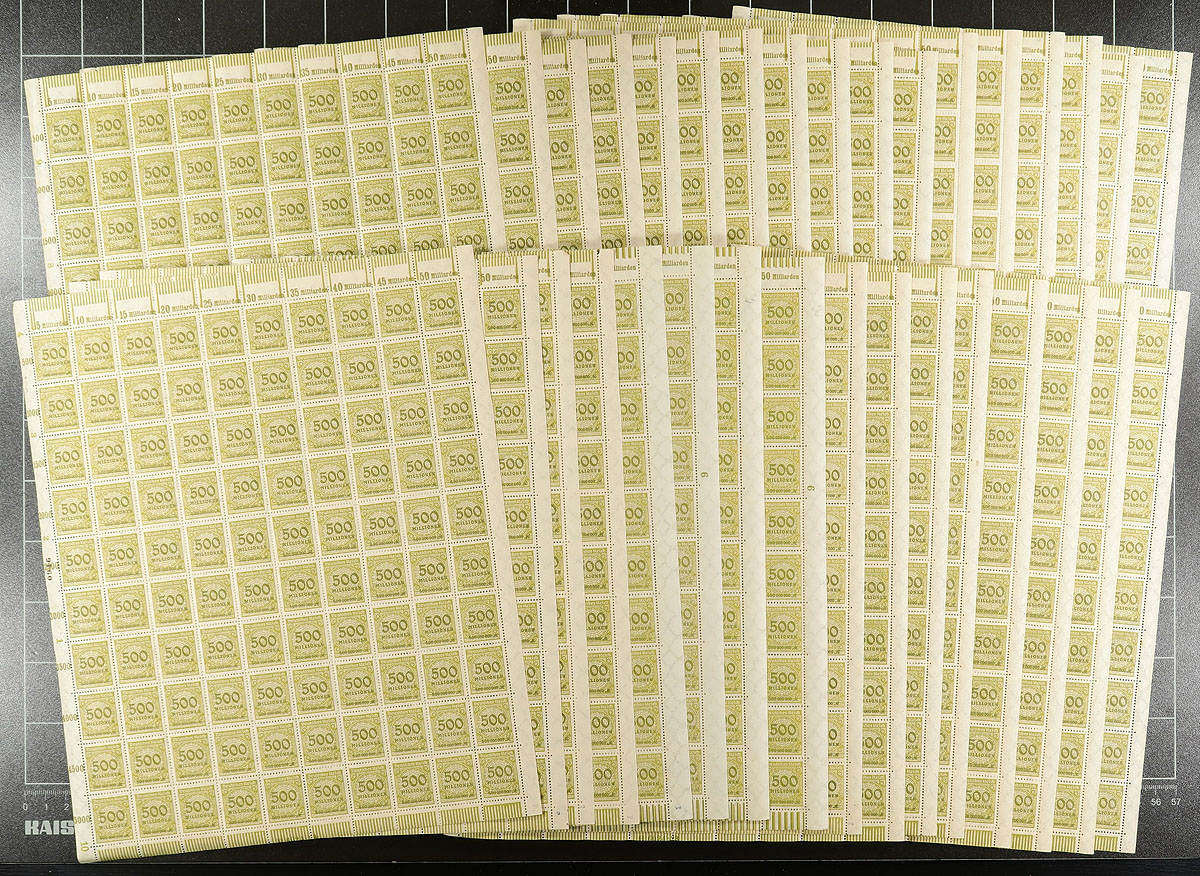 Bundle with a couple hundred mint complete sheets from the post-WWI hyper-inflation era. Has light to moderate duplication, most appear to be never hinged, and only a couple of gum faults are noted. While most of the stamps are common, these sheets are little works of art with interesting printing in the selvedge. A couple of the sheets were apparently caught in the perforator twice, as there are double perforations in the selvage. Estimate =