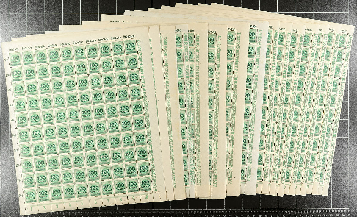 Bundle with a couple hundred mint complete sheets from the post-WWI hyper-inflation era. Has light to moderate duplication, most appear to be never hinged, and only a couple of gum faults are noted. While most of the stamps are common, these sheets are little works of art with interesting printing in the selvedge. A couple of the sheets were apparently caught in the perforator twice, as there are double perforations in the selvage. Estimate =