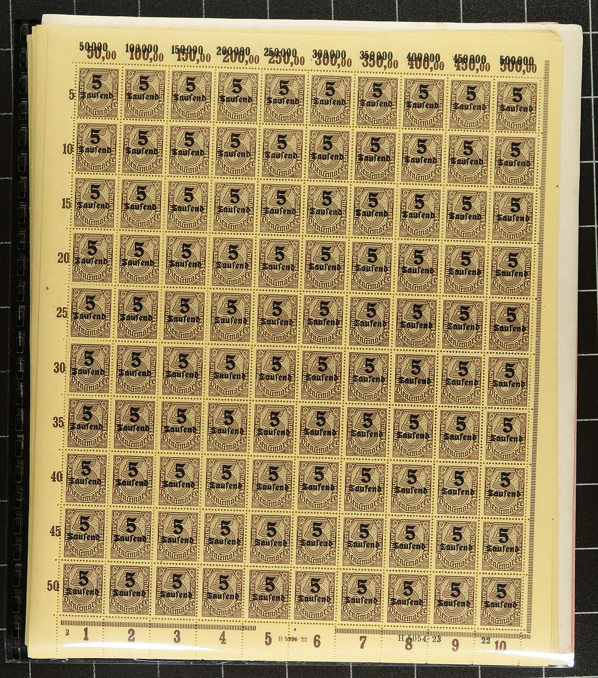 Complete panes in three stanzas. The first is a mint sheet file with a dozen Hitler panes (or half panes) between #506/529. The second is another mint sheet file with Germany and Berlin semi-postals in folded sheets of 100 (#B388/403, #9NB33-36), these catalogue over $300.00. The final part are several different hyper-inflation era "Official" sheets (1 to 10 of each), including overprints. All appear to be in very nice condition. Great eye appeal. Estimate =