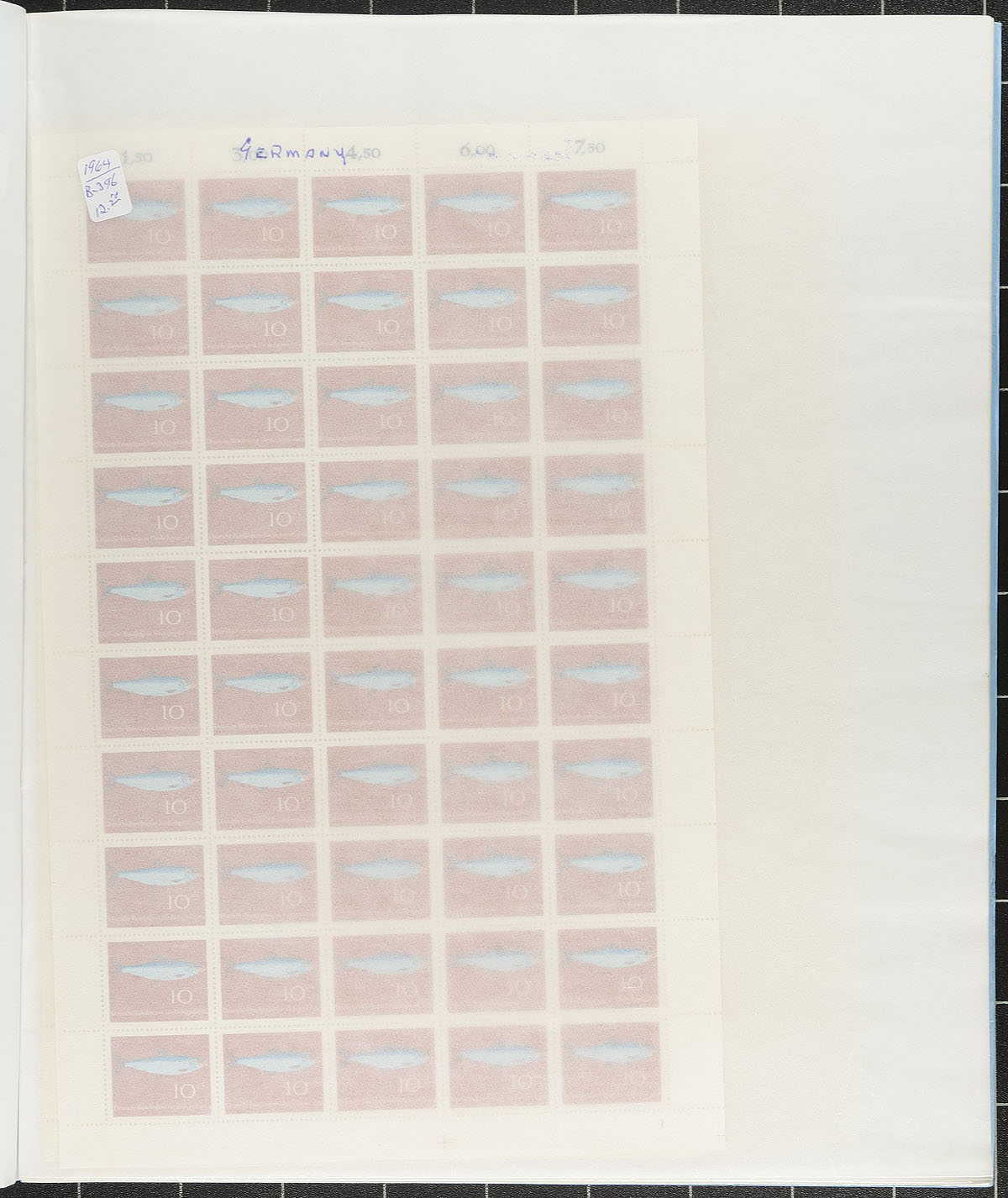 Complete panes in three stanzas. The first is a mint sheet file with a dozen Hitler panes (or half panes) between #506/529. The second is another mint sheet file with Germany and Berlin semi-postals in folded sheets of 100 (#B388/403, #9NB33-36), these catalogue over $300.00. The final part are several different hyper-inflation era "Official" sheets (1 to 10 of each), including overprints. All appear to be in very nice condition. Great eye appeal. Estimate =
