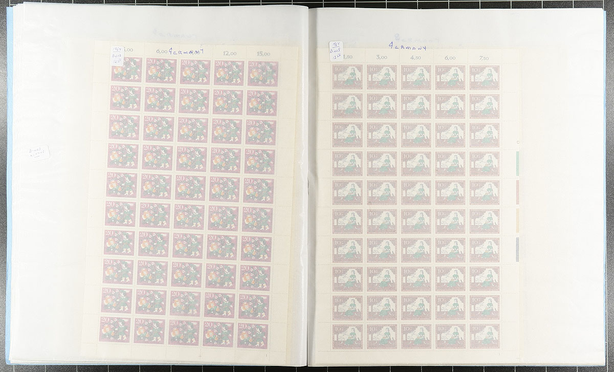 Complete panes in three stanzas. The first is a mint sheet file with a dozen Hitler panes (or half panes) between #506/529. The second is another mint sheet file with Germany and Berlin semi-postals in folded sheets of 100 (#B388/403, #9NB33-36), these catalogue over $300.00. The final part are several different hyper-inflation era "Official" sheets (1 to 10 of each), including overprints. All appear to be in very nice condition. Great eye appeal. Estimate =