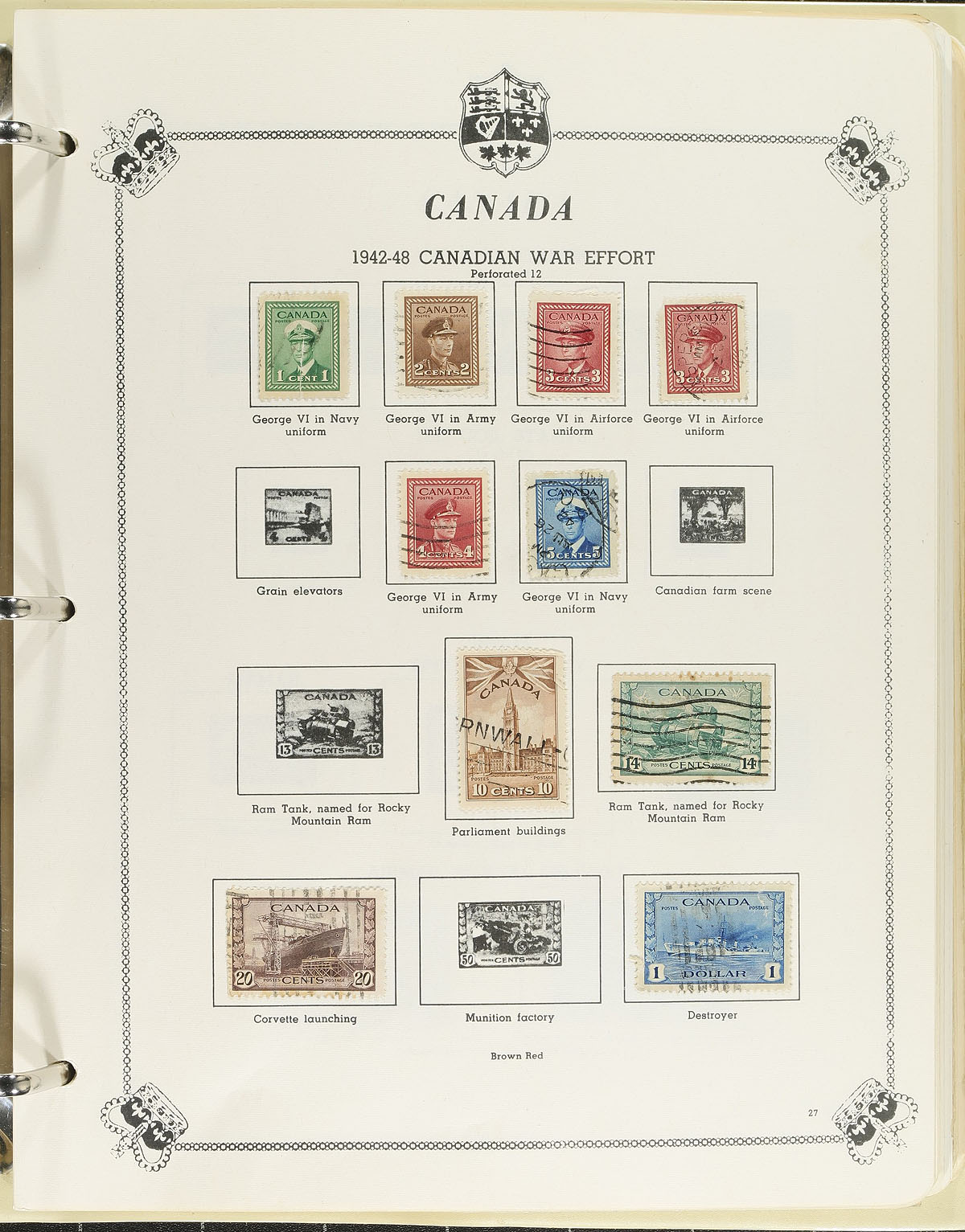 Bankers box filled with an accumulation of several partial collections, the best being an 18-ring Lindner padded album with hingeless pages to 1975 with a starter level mint and used collection (album replacement value is over $250.00!). There are several other partial collections, with mostly 20th century stamps (more used than mint) and a 2000 Millenium offering (mint sheetlets, FDC, complete set of used singles). There is an album of various early NHL issues, including a number of the "stamp/card" issues. All of this is complimented with some stockpages (lots of used blocks here, including King George V and VI) and a trio of small stockbooks. Most of these were individual lots at other local bidboards and were never touched after purchasing. There will be some useful face value here, some cancels and even some potential for varieties. Estimate =