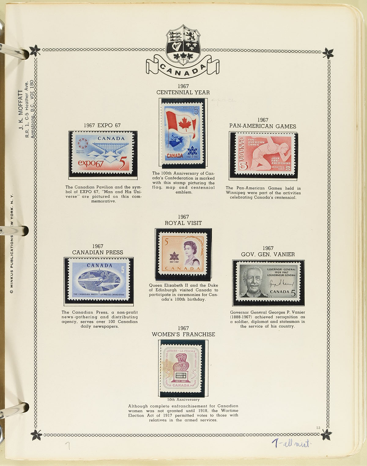 Bankers box filled with an accumulation of several partial collections, the best being an 18-ring Lindner padded album with hingeless pages to 1975 with a starter level mint and used collection (album replacement value is over $250.00!). There are several other partial collections, with mostly 20th century stamps (more used than mint) and a 2000 Millenium offering (mint sheetlets, FDC, complete set of used singles). There is an album of various early NHL issues, including a number of the "stamp/card" issues. All of this is complimented with some stockpages (lots of used blocks here, including King George V and VI) and a trio of small stockbooks. Most of these were individual lots at other local bidboards and were never touched after purchasing. There will be some useful face value here, some cancels and even some potential for varieties. Estimate =