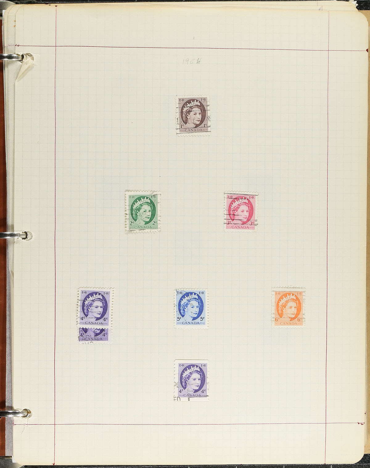 Bankers box filled with an accumulation of several partial collections, the best being an 18-ring Lindner padded album with hingeless pages to 1975 with a starter level mint and used collection (album replacement value is over $250.00!). There are several other partial collections, with mostly 20th century stamps (more used than mint) and a 2000 Millenium offering (mint sheetlets, FDC, complete set of used singles). There is an album of various early NHL issues, including a number of the "stamp/card" issues. All of this is complimented with some stockpages (lots of used blocks here, including King George V and VI) and a trio of small stockbooks. Most of these were individual lots at other local bidboards and were never touched after purchasing. There will be some useful face value here, some cancels and even some potential for varieties. Estimate =