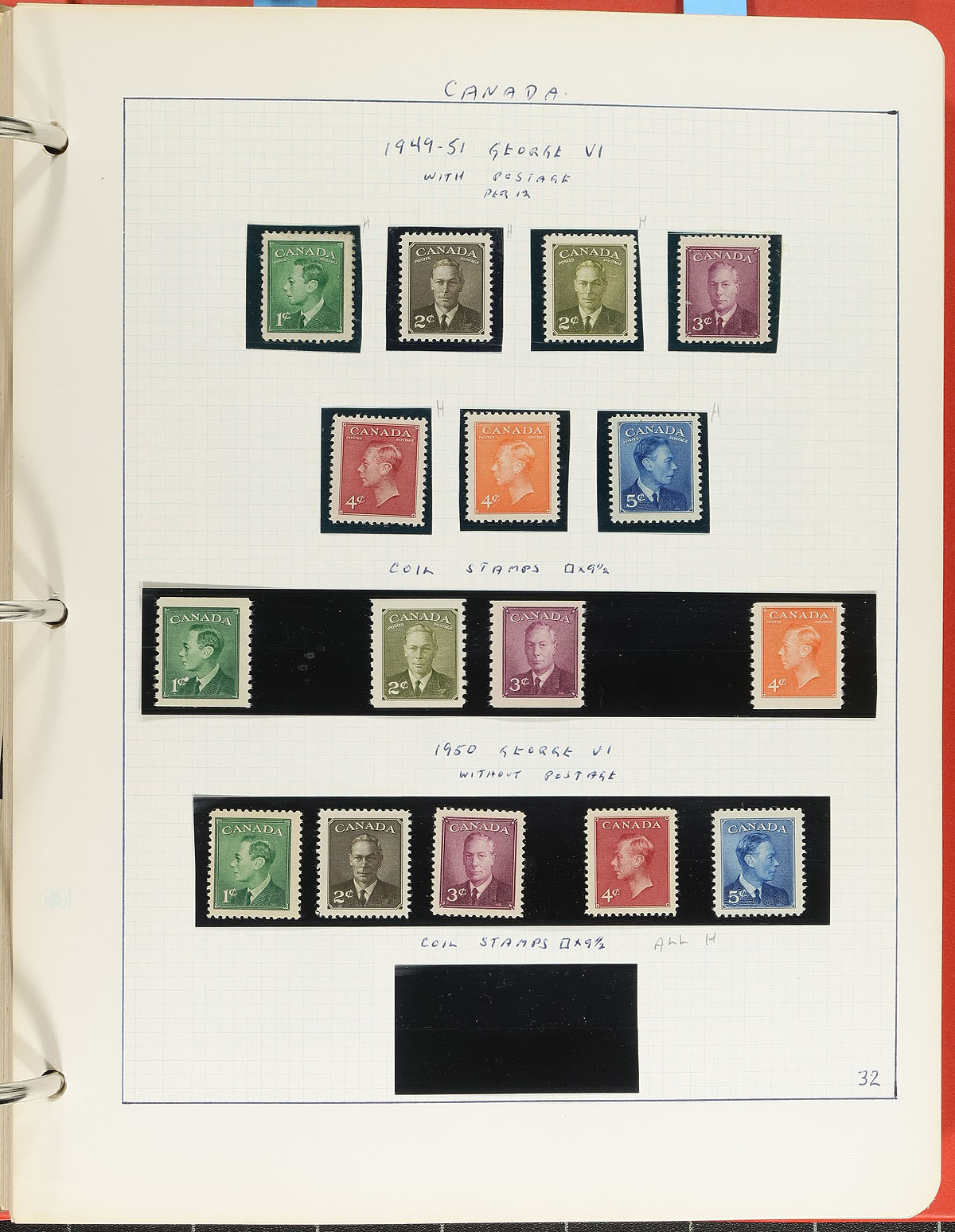 Bankers box filled with an accumulation of several partial collections, the best being an 18-ring Lindner padded album with hingeless pages to 1975 with a starter level mint and used collection (album replacement value is over $250.00!). There are several other partial collections, with mostly 20th century stamps (more used than mint) and a 2000 Millenium offering (mint sheetlets, FDC, complete set of used singles). There is an album of various early NHL issues, including a number of the "stamp/card" issues. All of this is complimented with some stockpages (lots of used blocks here, including King George V and VI) and a trio of small stockbooks. Most of these were individual lots at other local bidboards and were never touched after purchasing. There will be some useful face value here, some cancels and even some potential for varieties. Estimate =