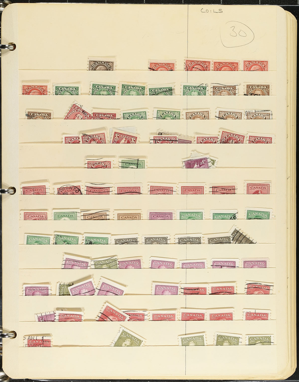 Bankers box filled with an accumulation of several partial collections, the best being an 18-ring Lindner padded album with hingeless pages to 1975 with a starter level mint and used collection (album replacement value is over $250.00!). There are several other partial collections, with mostly 20th century stamps (more used than mint) and a 2000 Millenium offering (mint sheetlets, FDC, complete set of used singles). There is an album of various early NHL issues, including a number of the "stamp/card" issues. All of this is complimented with some stockpages (lots of used blocks here, including King George V and VI) and a trio of small stockbooks. Most of these were individual lots at other local bidboards and were never touched after purchasing. There will be some useful face value here, some cancels and even some potential for varieties. Estimate =