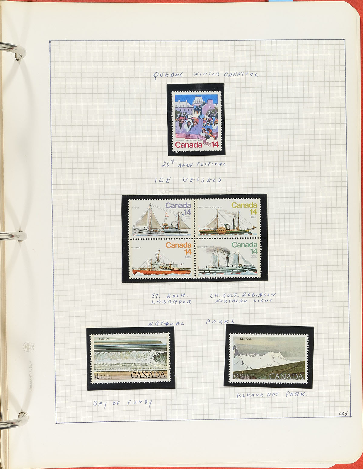Bankers box filled with an accumulation of several partial collections, the best being an 18-ring Lindner padded album with hingeless pages to 1975 with a starter level mint and used collection (album replacement value is over $250.00!). There are several other partial collections, with mostly 20th century stamps (more used than mint) and a 2000 Millenium offering (mint sheetlets, FDC, complete set of used singles). There is an album of various early NHL issues, including a number of the "stamp/card" issues. All of this is complimented with some stockpages (lots of used blocks here, including King George V and VI) and a trio of small stockbooks. Most of these were individual lots at other local bidboards and were never touched after purchasing. There will be some useful face value here, some cancels and even some potential for varieties. Estimate =