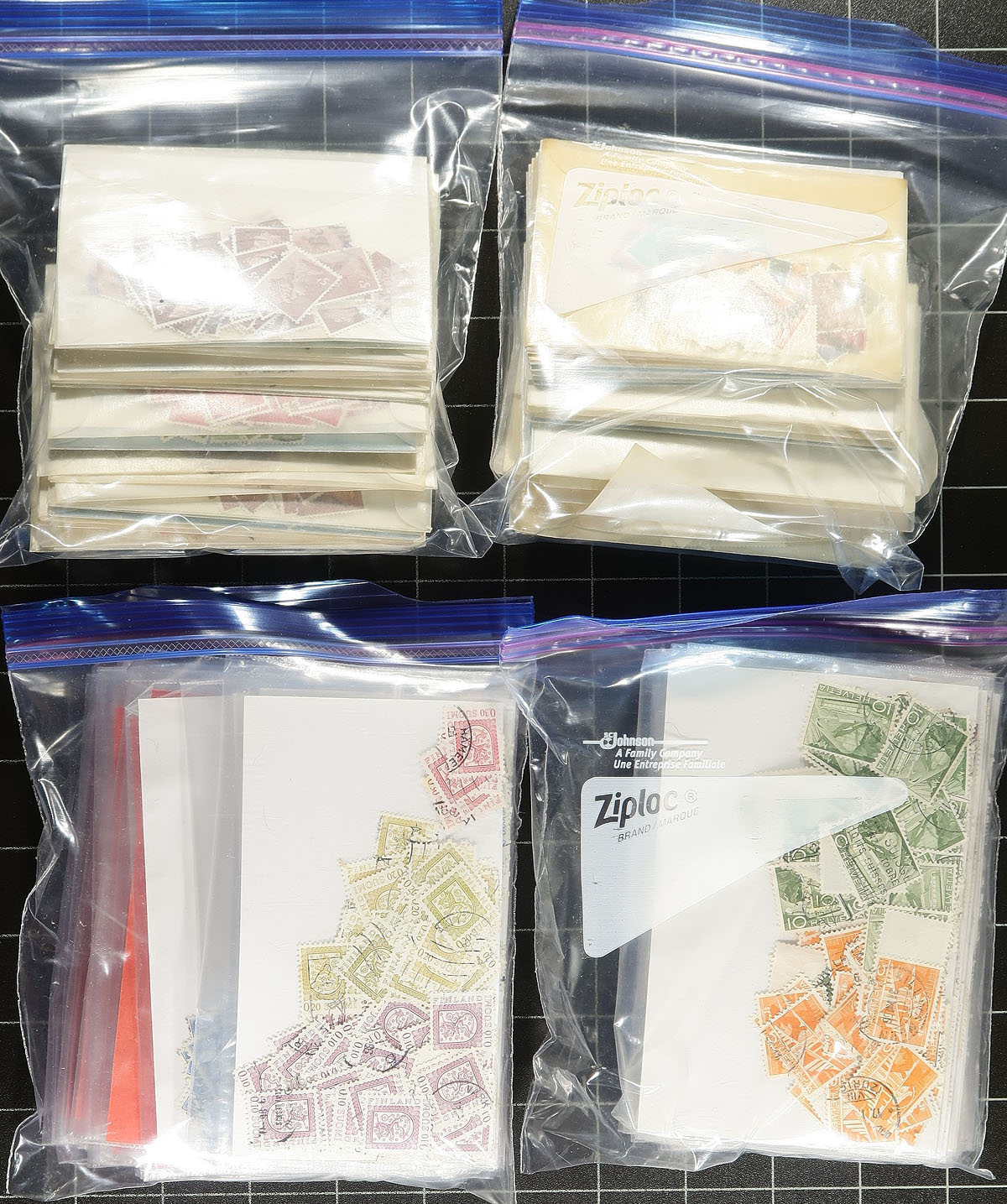 U-Haul box packed with freezer bags with assorted stamps, with about half on-paper (strength in Great Britain and Canada) and then there are many smaller bags with single country or worldwide off paper (a wide range of countries). Plus, there are two boxes of "102" cards with GB and New Zealand used material. While much of the material has been given a rough sort, there is still much to be discovered. As received from an estate. Estimate =