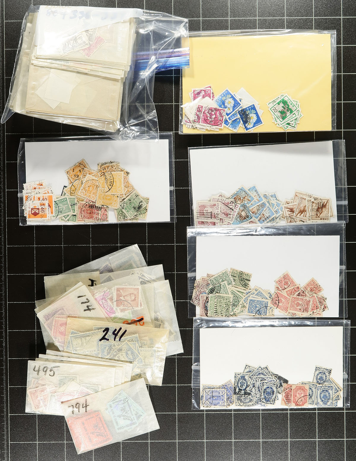 U-Haul box packed with freezer bags with assorted stamps, with about half on-paper (strength in Great Britain and Canada) and then there are many smaller bags with single country or worldwide off paper (a wide range of countries). Plus, there are two boxes of "102" cards with GB and New Zealand used material. While much of the material has been given a rough sort, there is still much to be discovered. As received from an estate. Estimate =