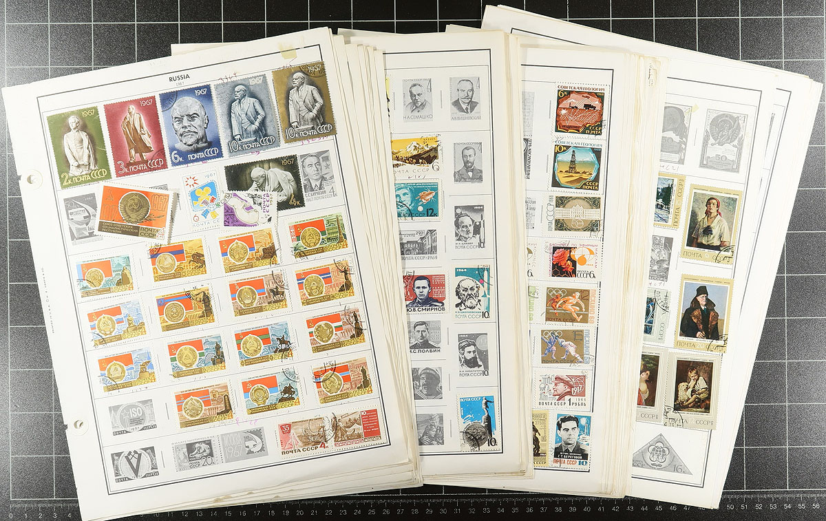 Bankers box with an assortment of Europe-strong albums (but with representation from other regions). In no particular order are a couple of groups of Russian/USSR material, a bit of French material, an old KABE album with a Swedish collection, and a Scott Specialty album holding some Denmark material, plus a stockbook of topical-rich material. There is also a bit of British Commonwealth and three albums with various quantities of worldwide material. Lots of stamps and there could be lots of hidden gems throughout. Estimate =