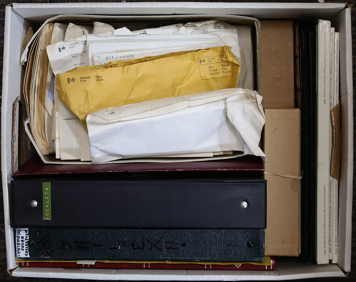 Balance of an estate of mostly used Canada, starting with a small handful of Vario-pages with a priced accumulation of Queen Victoria to early QEII including some "back of the book", annual collections for 1978, 1980 and 1984, three or four groups of mostly used Centennial material with papers, booklets, some covers and stationery. Follow all that with a mint sheet file has a number of 1960’s era sheets and large blocks but most are stuck down and concluding with a couple of shoe boxes and three other smaller boxes of assorted used stamps. Fills a bankers box. Estimate =