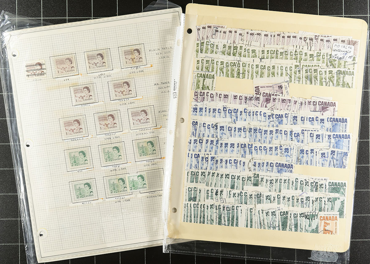 Balance of an estate of mostly used Canada, starting with a small handful of Vario-pages with a priced accumulation of Queen Victoria to early QEII including some "back of the book", annual collections for 1978, 1980 and 1984, three or four groups of mostly used Centennial material with papers, booklets, some covers and stationery. Follow all that with a mint sheet file has a number of 1960’s era sheets and large blocks but most are stuck down and concluding with a couple of shoe boxes and three other smaller boxes of assorted used stamps. Fills a bankers box. Estimate =