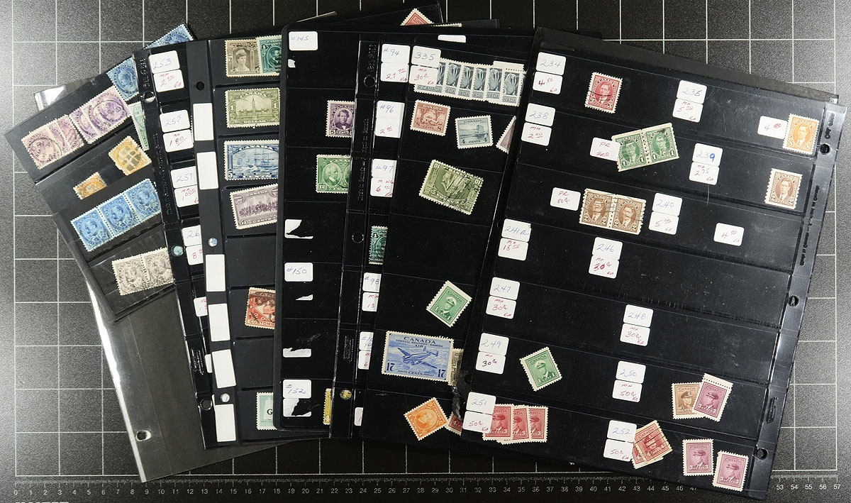 Balance of an estate of mostly used Canada, starting with a small handful of Vario-pages with a priced accumulation of Queen Victoria to early QEII including some "back of the book", annual collections for 1978, 1980 and 1984, three or four groups of mostly used Centennial material with papers, booklets, some covers and stationery. Follow all that with a mint sheet file has a number of 1960’s era sheets and large blocks but most are stuck down and concluding with a couple of shoe boxes and three other smaller boxes of assorted used stamps. Fills a bankers box. Estimate =