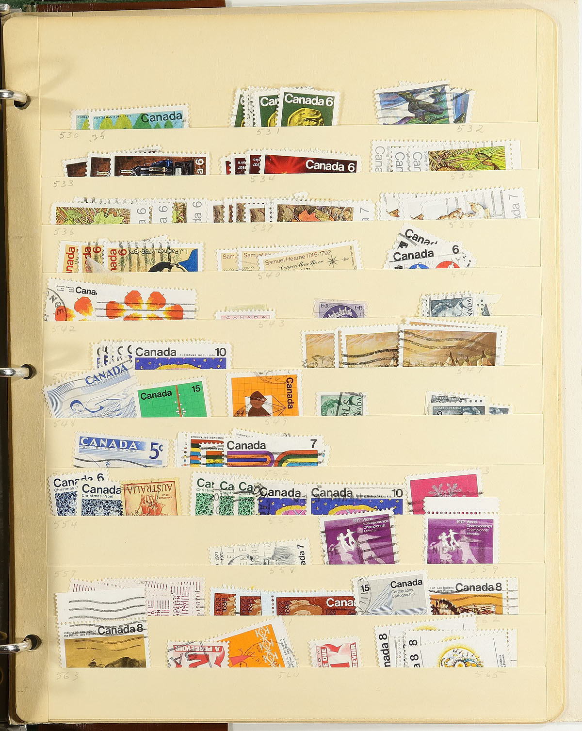U-Haul box worth of several mostly used Canada collections and accumulations on album and stockpages, plus three boxes filled with envelopes and bundles of sorted material. While there is a bit of Victorian material, most is mid to later 20th century. Expect most to be common, with the potential for the variety or cancel hunter, with the occasional better item poking out here and there. The balance of an estate. Estimate =