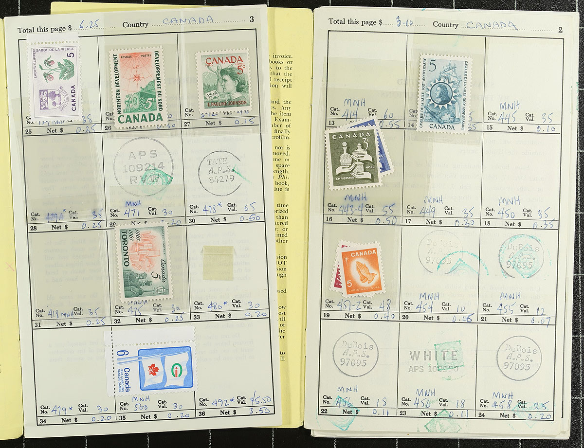 U-Haul box worth of several mostly used Canada collections and accumulations on album and stockpages, plus three boxes filled with envelopes and bundles of sorted material. While there is a bit of Victorian material, most is mid to later 20th century. Expect most to be common, with the potential for the variety or cancel hunter, with the occasional better item poking out here and there. The balance of an estate. Estimate =
