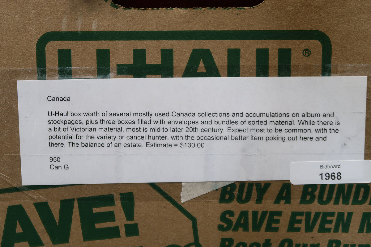 U-Haul box worth of several mostly used Canada collections and accumulations on album and stockpages, plus three boxes filled with envelopes and bundles of sorted material. While there is a bit of Victorian material, most is mid to later 20th century. Expect most to be common, with the potential for the variety or cancel hunter, with the occasional better item poking out here and there. The balance of an estate. Estimate =