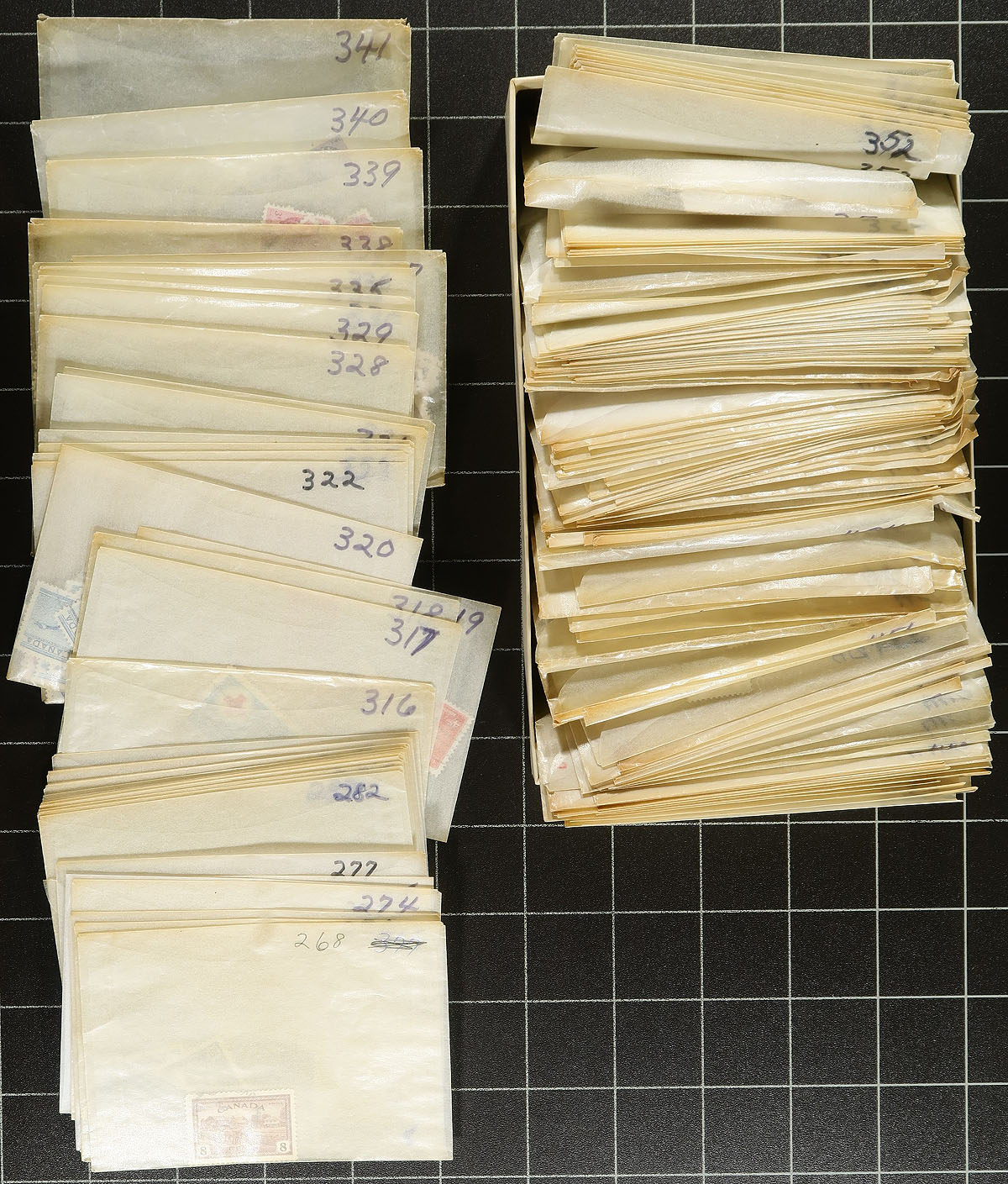 U-Haul box worth of several mostly used Canada collections and accumulations on album and stockpages, plus three boxes filled with envelopes and bundles of sorted material. While there is a bit of Victorian material, most is mid to later 20th century. Expect most to be common, with the potential for the variety or cancel hunter, with the occasional better item poking out here and there. The balance of an estate. Estimate =