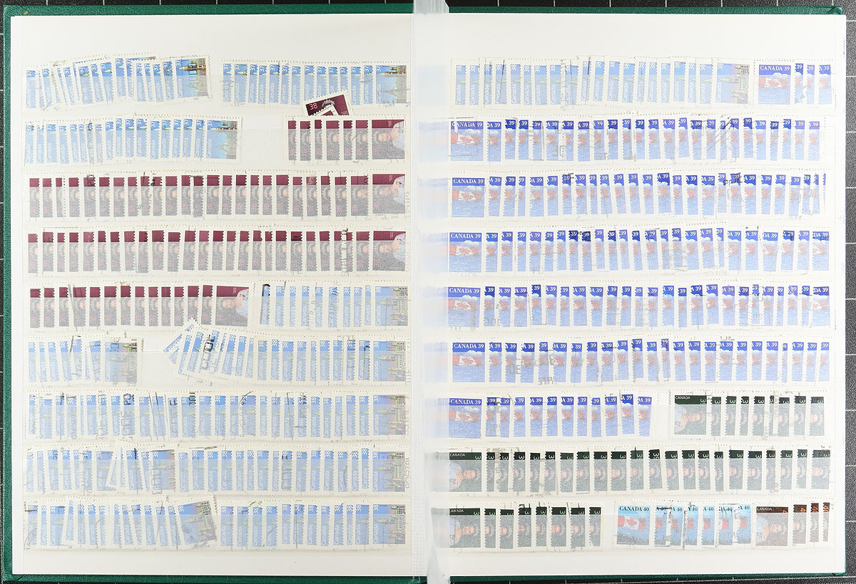 U-Haul box worth of several mostly used Canada collections and accumulations on album and stockpages, plus three boxes filled with envelopes and bundles of sorted material. While there is a bit of Victorian material, most is mid to later 20th century. Expect most to be common, with the potential for the variety or cancel hunter, with the occasional better item poking out here and there. The balance of an estate. Estimate =