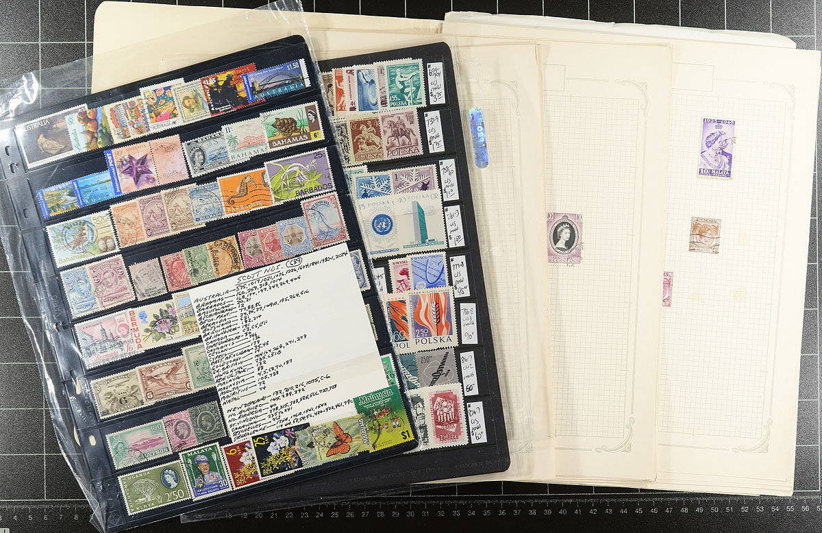 Box 1: A "wild and wonderful" estate balance filling a bankers box. In no particular order, there is a series of stockpages with British Commonwealth, strong in 1937-1960's "Common Design" issues, plus some other pages of assorted used material (the page of Cyprus was catalogued by the owner at $250+). There is a couple of Indonesia presentation folders and one from Iceland (1952) plus a small concentration of material from Malaya, Liberia, Nepal, USA plus some "Art" stamps. The sleeper here is a pair of almost 100-year-old books, one a stockbook with mint and used Europe-strong multiples and a starter collection in a notebook with some nice 1920’s-1930’s Canada (the mint appears to be heavily stuck, but we were able to free a few up, leaving them with quite light hinging). Estimate =